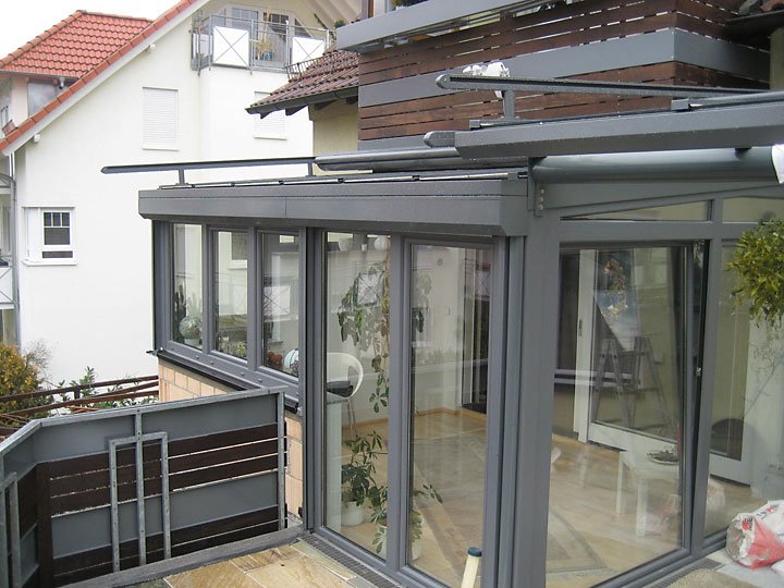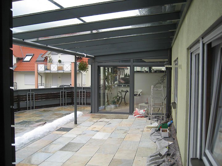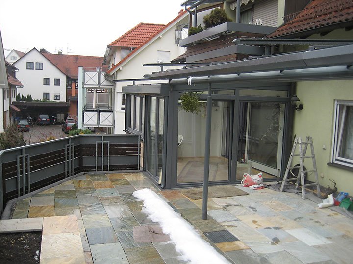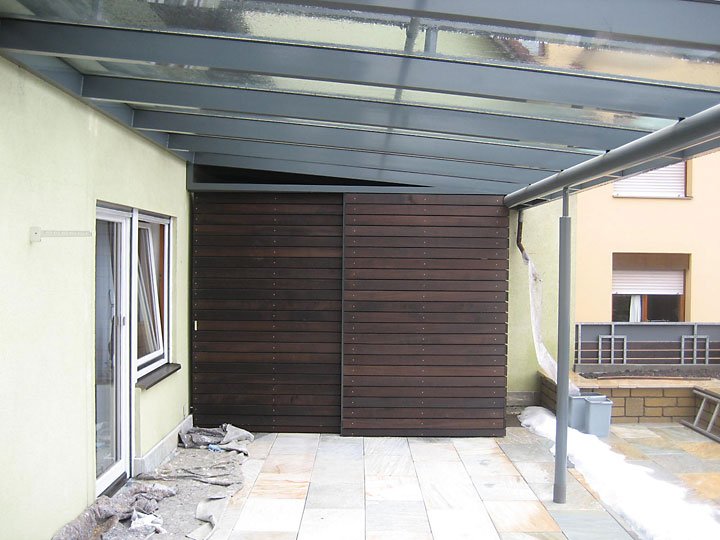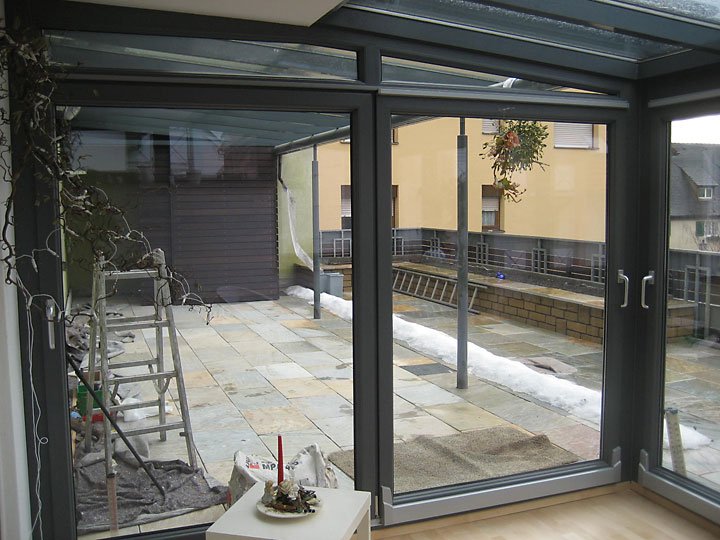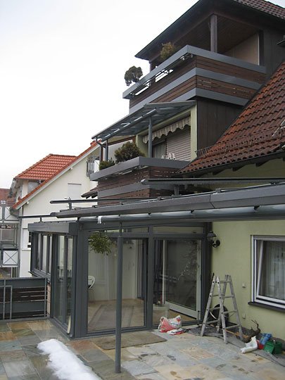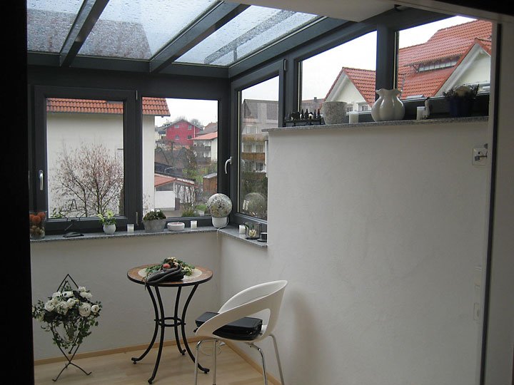 Ausführung: Alu-KunststoffkonstruktionBesonderheiten: Wintergarten und Terrassendach mit Stauraum für PolsterungBaujahr: 2009