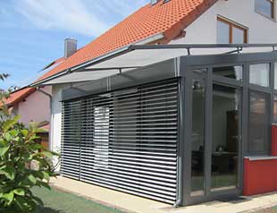 Weit verbreitet ist der textile Sonnenschutz mit einer breiten Palette an Dessins. Die Gewebebahnen verlaufen in seitlichen Führungsschienen. Fassadenmarkisen sind für den senkrechten Bereich gedacht, können aber auch bei Dächern über 30 Grad Neigung eingesetzt werden. Für flachere Dachneigungen sind spezielle Wintergartenmarkisen mit Gegenzug entwickelt worden. Gebogene Komplettanlagen, die Dach und Fassade in einem Zuge verschatten, haben den Nachteil, dass z. B. eine Fassadenabdeckung als Sichtschutz immer auch den Ausblick in den Himmel verdecken. Geteilte Systeme sind also gezielter einsetzbar.