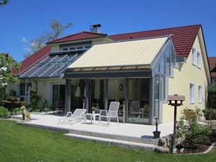 MarkisenWeit verbreitet ist der textile Sonnenschutz mit einer breiten Palette an Dessins. Die Gewebebahnen verlaufen in seitlichen Führungsschienen. Fassadenmarkisen sind für den senkrechten Bereich gedacht, können aber auch bei Dächern über 30 Grad Neigung eingesetzt werden. Für flachere Dachneigungen sind spezielle Wintergartenmarkisen mit Gegenzug entwickelt worden. Gebogene Komplettanlagen, die Dach und Fassade in einem Zuge verschatten, haben den Nachteil, dass z. B. eine Fassadenabdeckung als Sichtschutz immer auch den Ausblick in den Himmel verdecken. Geteilte Systeme sind also gezielter einsetzbar.